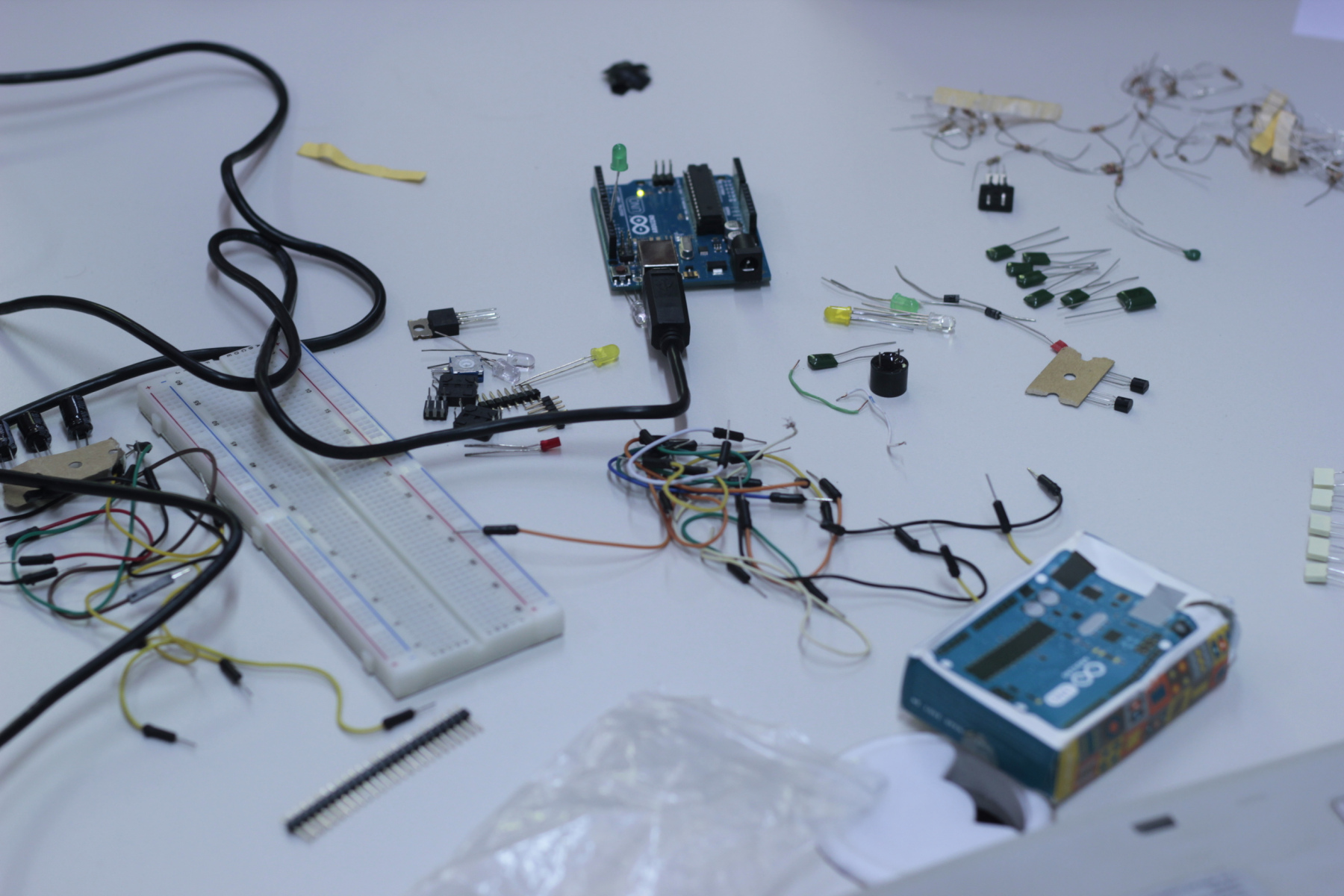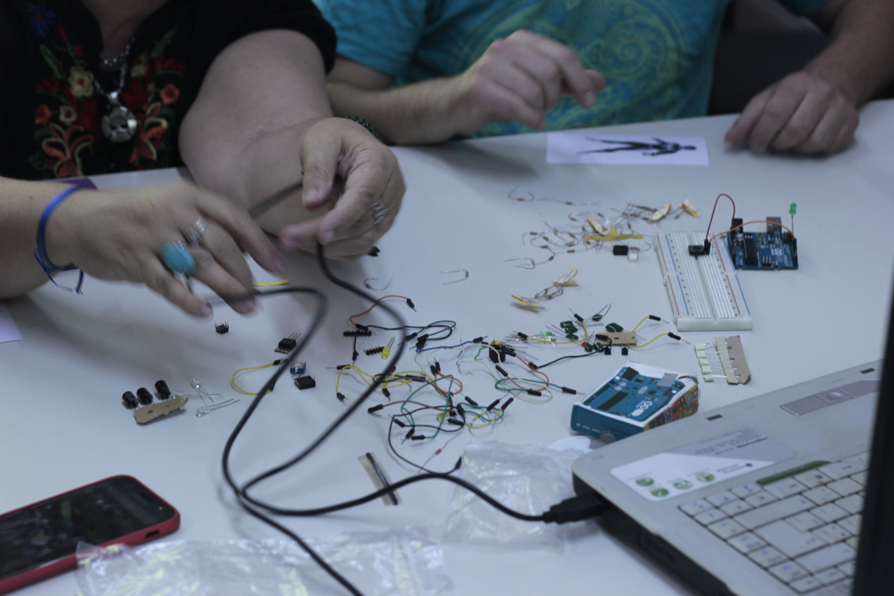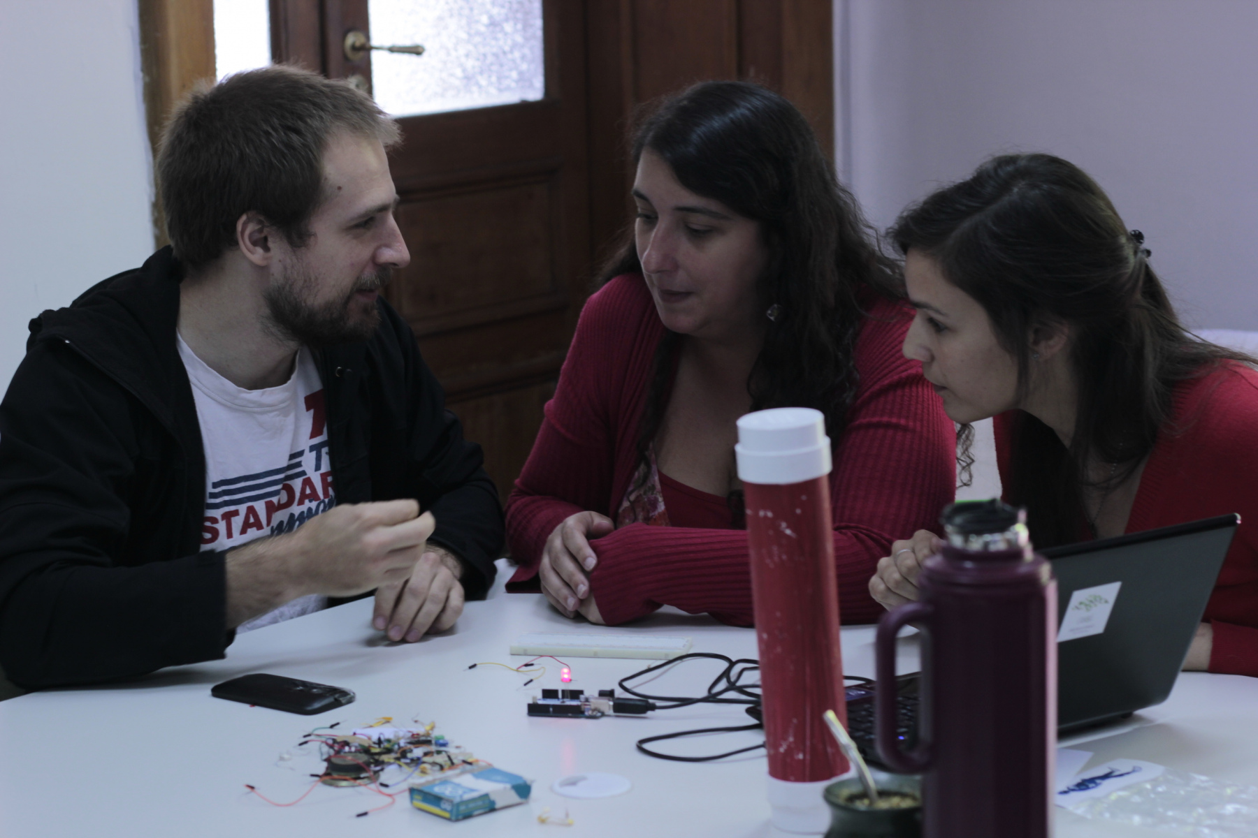 Luces, movimiento, sensores, en grupos y a veces charlando sobre cualquier otra cosa, entre todos fuimos descubriendo y hallando nuevas formas de interacción con la tecnología, con el Hardware Arduino, con la electrónica, con los elementos dispuestos para jugar. A veces tocando el código, a veces sin que se mueva el motor, compartimos varias hs de exploraciones y hallazgos. Como siempre, la propuesta final es integradora. Crear un objeto nuevo, que sirva para algo, real o imaginario, pero colectivo. Ese es el desafío más grande, ponerse de acuerdo en lo proyectual, en las ideas, distribuir los roles. No llegamos a terminar, pero presentaron los prototipos y las ideas, los cambios que habría que hacerle al código, etc. En el final, intercambiamos reflexiones y pensamientos sobre la práctica. También, sobre las tecnologías en la escuela, sobre la tarea de nosotros los educadores, nuestra falta de capacitación, el potencial de las herramientas tecnológicas en el aula, etc. Pasadas las dos de la tarde, nos encontramos hablando y escuchando, intercambiando. Siempre creciendo, siempre apostando a estos encuentros de ejercicio consciente de la tarea que elegimos hacer.