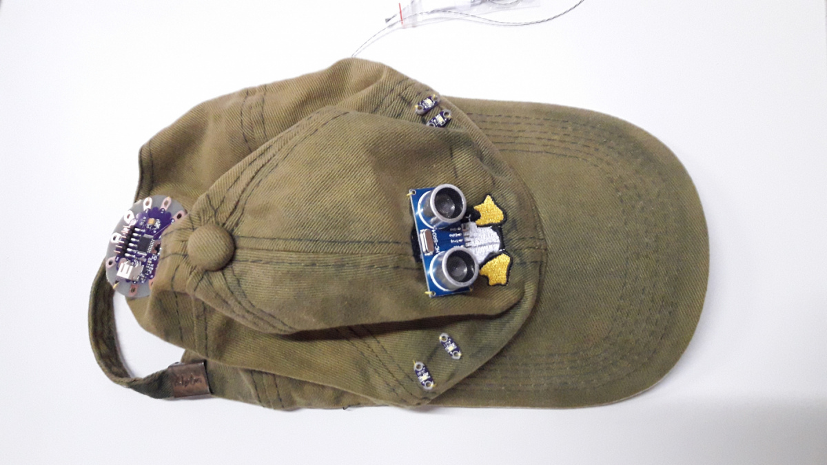 Entonces, nos pusimos a pensar que proyecto podíamos hacer para poner en juego los conocimientos adquiridos.. encontamos una vieja gorra que estaba dando vueltas en la oficina, y empezamos a imaginar como podiamos integrar unos sensores de proximidad que conseguimos un tiempo atrás. De ahí salió la idea de que la gorra active unas luces LED cuando encuentre un objeto a menos de 16 centímetros.