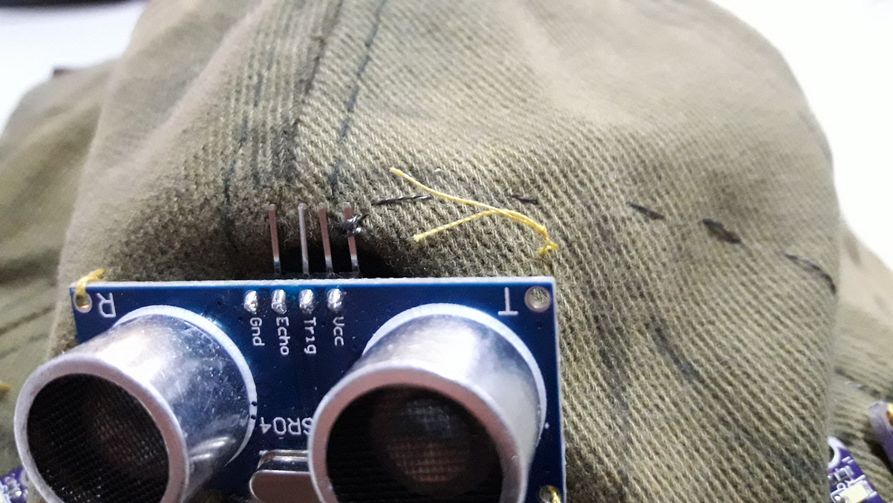 Y finalmente, cosimos los componentes a la gorra con hilo común de algodón, y utlizando el hilo conductor, unimos los componentes según el circuito: