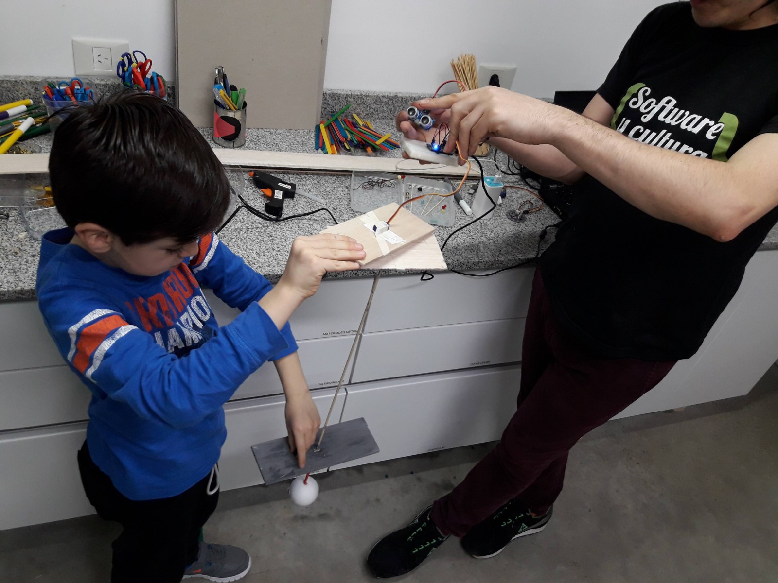 Cuando llevamos adelante un taller de este tipo, nuestra propuesta adquiere vida propia cuando es internalizada por los niñxs. Nosotrxs vamos con una idea, con disparadores, con propuestas, pero lxs niñxs toman la posta y la llevan a lugares que no habíamos imaginado. Las obras iniciales eran abstractas y a casi todos les disparó la idea de personificar y armar robotitos. En los equipos de grandes y chicxs fueron encontrando dinámicas propias de trabajo y sentidos nuevos.