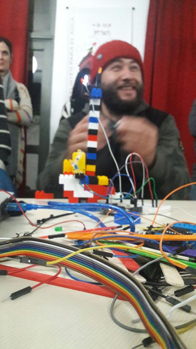 Por medio de los desafíos tecnológicos y apoyados en nuestra nueva plataforma educativa, lxs participantes organizados en equipos, tuvieron la experiencia de acercarse a los elementos de trabajo sin mediadores ni artificios. Los cables, el arduino, los shields, los sensores, los motores, los leds, desparramados en las mesas sirvieron como excusa para proponer una vinculación distinta con elementos que a priori son extraños, ajenos o generan miedo. Lo cierto es que si abriéramos los dispositivos electrónicos o los artefactos tecnológicos que nos rodean, posiblemente nos encontremos con elementos parecidos a los del tubo. En un ambiente cuidado, seguro y en confianza es donde habilitamos el intercambio de conocimientos, la apropiación de los recursos y la distribución de saberes.