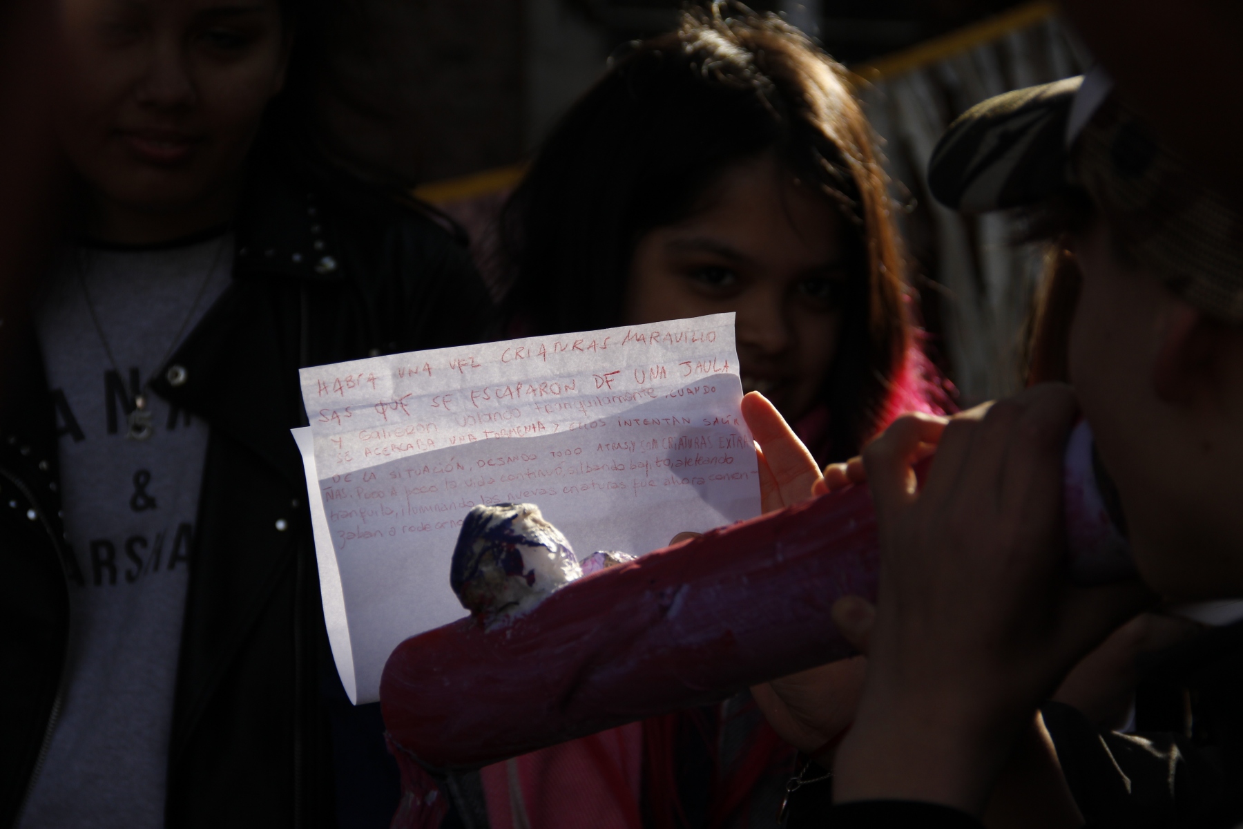 “Había una vez, criaturas maravillosas que se escaparon de una jaula y salieron volando tranquilamente, cuando se acercaba una tormenta y ellos intentan salir de la situación dejando todo atrás y son criaturas extrañas. Poco a poco, la vida continuó, silbando bajito, aleteando tranquilas, iluminando a las nuevas criaturas que ahora comenzaban a rodearnos.”