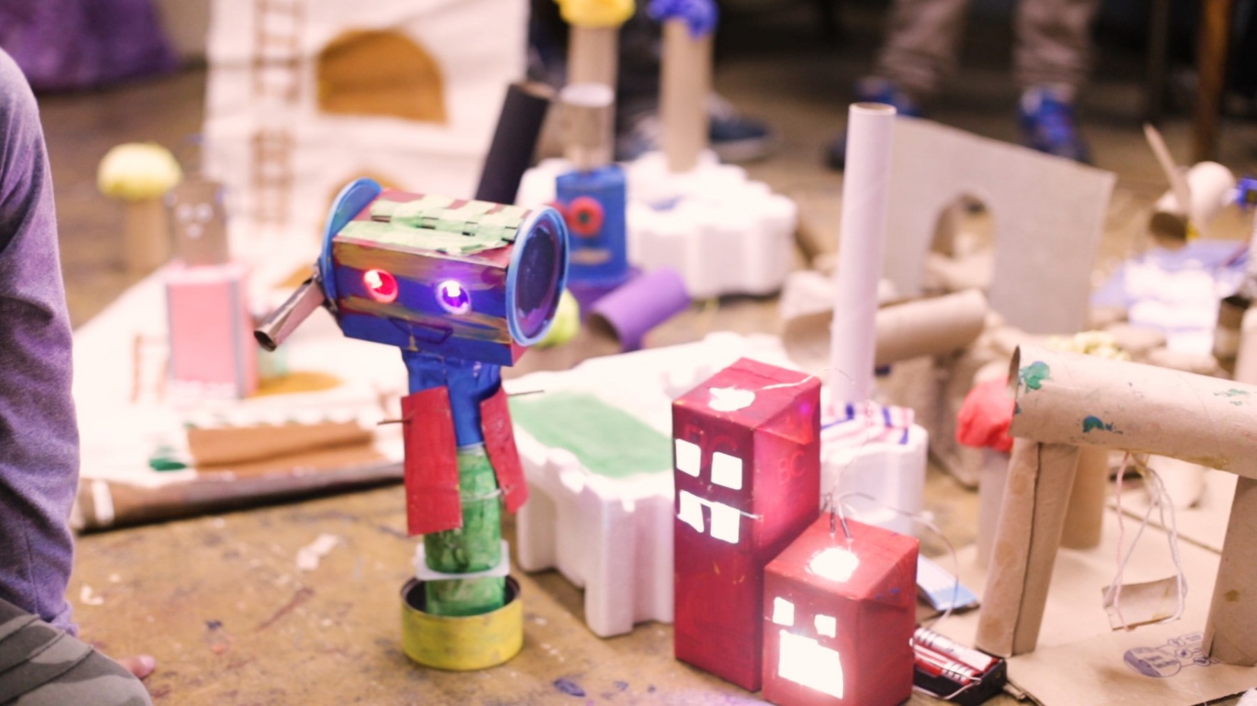 Cuando cada unx terminó su autorretrato, en grupos fueron trabajando la ciudad en donde viven todas las creaciones. Una ciudad llamada “Robot Land”, con su paisaje futurista, un sol y una luna alternando las apariciones, una escultura gigante con una máscara luminosa oficiando de tótem, edificios con luces, plazas iluminadas y más.