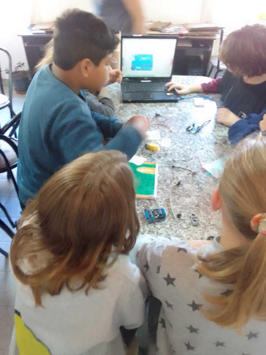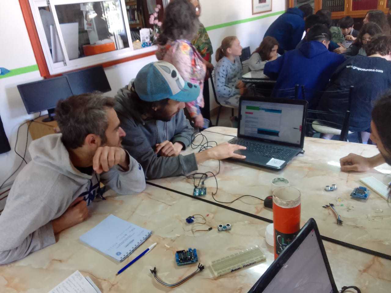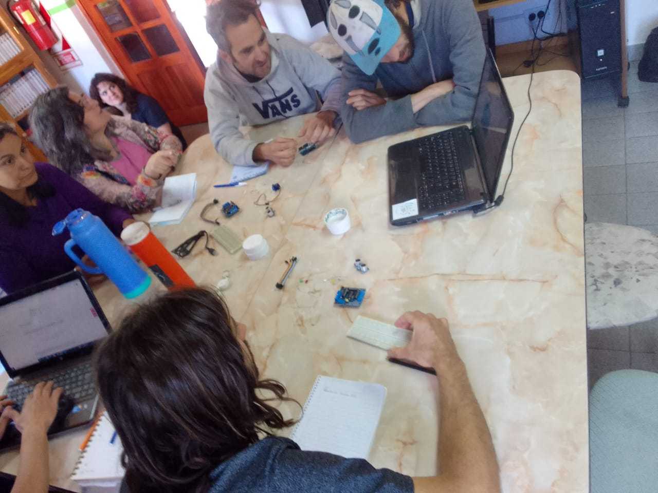 Gracias a Matías y Caro, y al equipo de trabajo de la biblioteca que se encargaron de la difusión del taller, pudimos tener una muy buena convocatoria y hubo tanta demanda que decidimos armar distintos grupos de niñeces, adolescentes y adultes, ya que hay varios proyectos educativos no-formales en la zona con mucha inquietud en incorporar este tipo de actividades artístico-tecnológicas.
