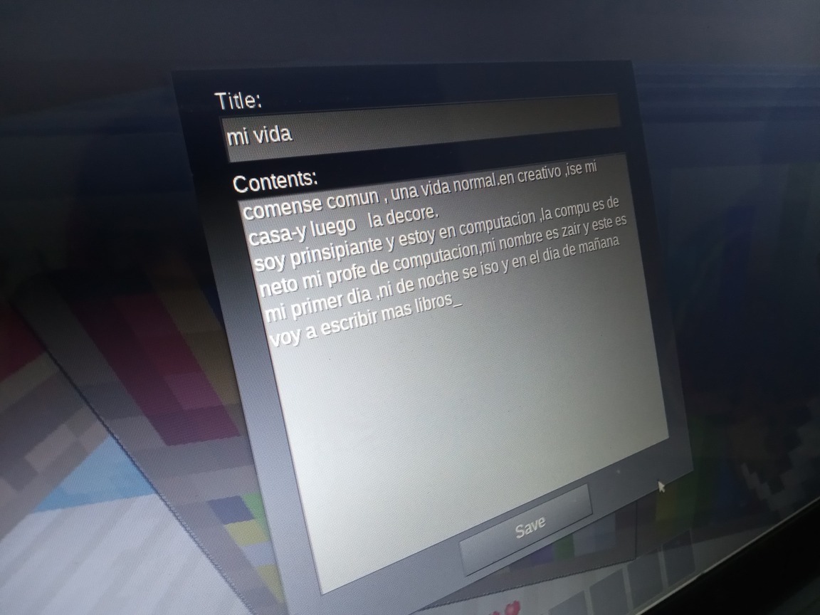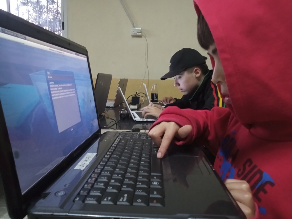 Otro de los juegos que utilizamos fue el Minetest, un juego tipo “Minecraft” pero de Software Libre. Aquí sucedió algo muy interesante, ya que desde la coordinación del espacio no habíamos utilizado este software y uno de los asistentes se entusiasmó y comenzó a crear un “mundo”, y entre muchas otras cosas, creó una biblioteca y comenzó a escribir un libro dentro de ella… Así fue como descubrimos las posibilidades de este software y nos generó la inquietud de pensar y diseñar actividades para realizar dentro de estos mundos virtuales, e inclusive, de manera grupal ya que en ocasiones propusimos abrir ese “mundo” y conectarnos desde otras computadoras en la red local.