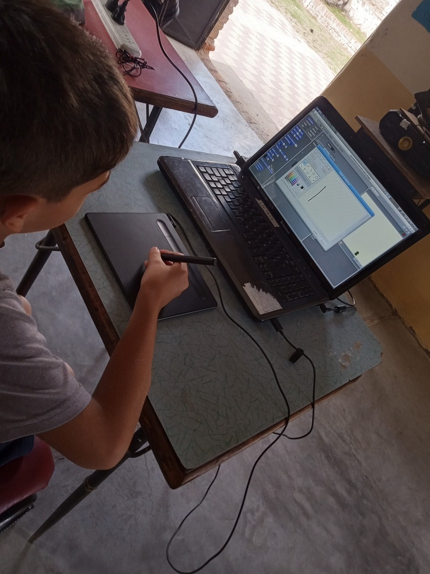 Un elemento que incorporamos gracias a la donación de nuestro desarrollador y docente amigo Alvar, fue una tableta Wacom para dibujar. Este dispositivo se hizo popular rápidamente entre las niñeces y nos permitió generar espacios de recreación y arte, usando principalmente el software krita.