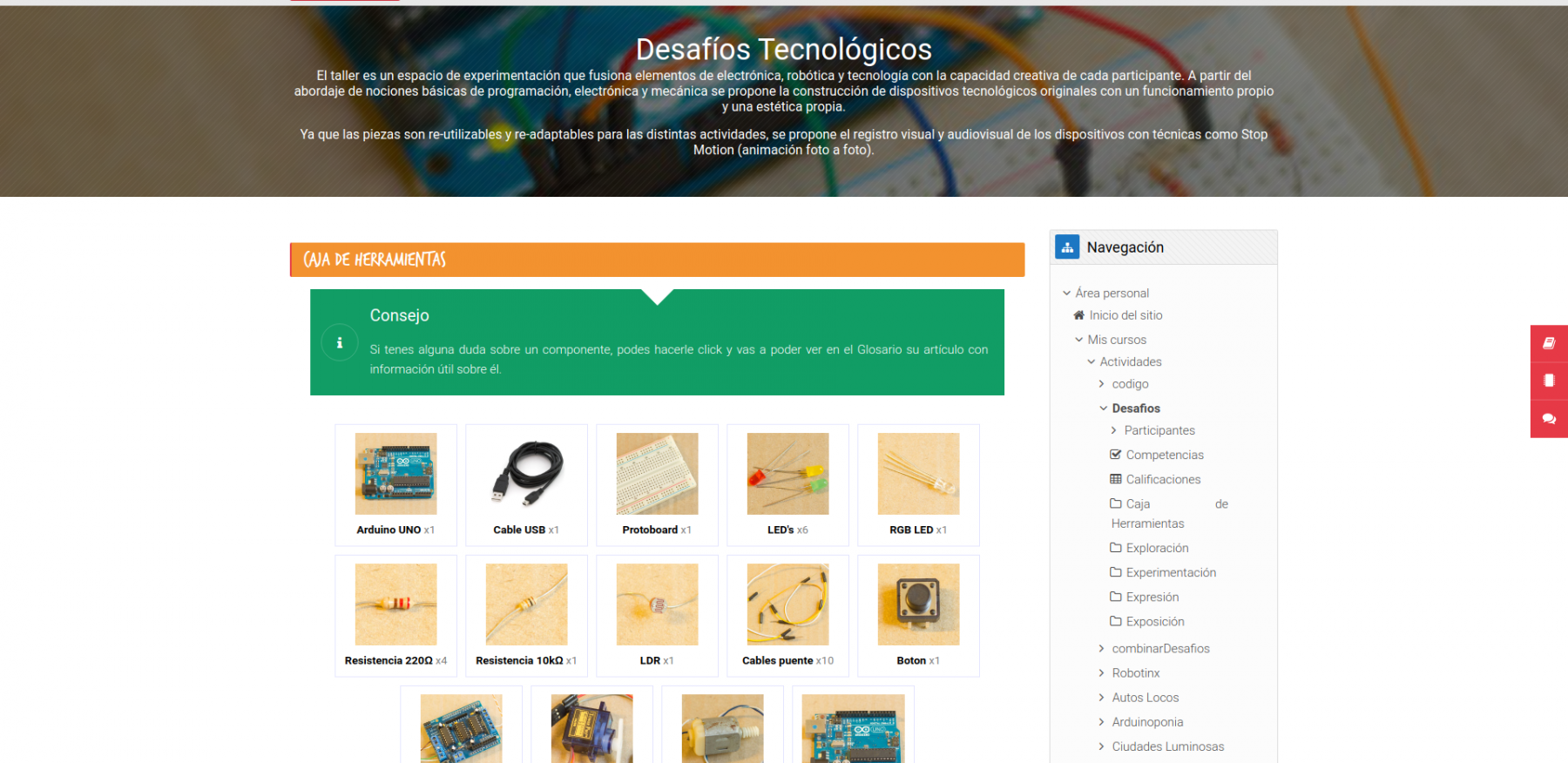Funciona como complemento para acompañar tanto a educadores como estudiantes. Cuenta con varios cursos que van desde encender los primeros LED’s a construir un robot que se mueva e interactúe con los estímulos que lo rodean.